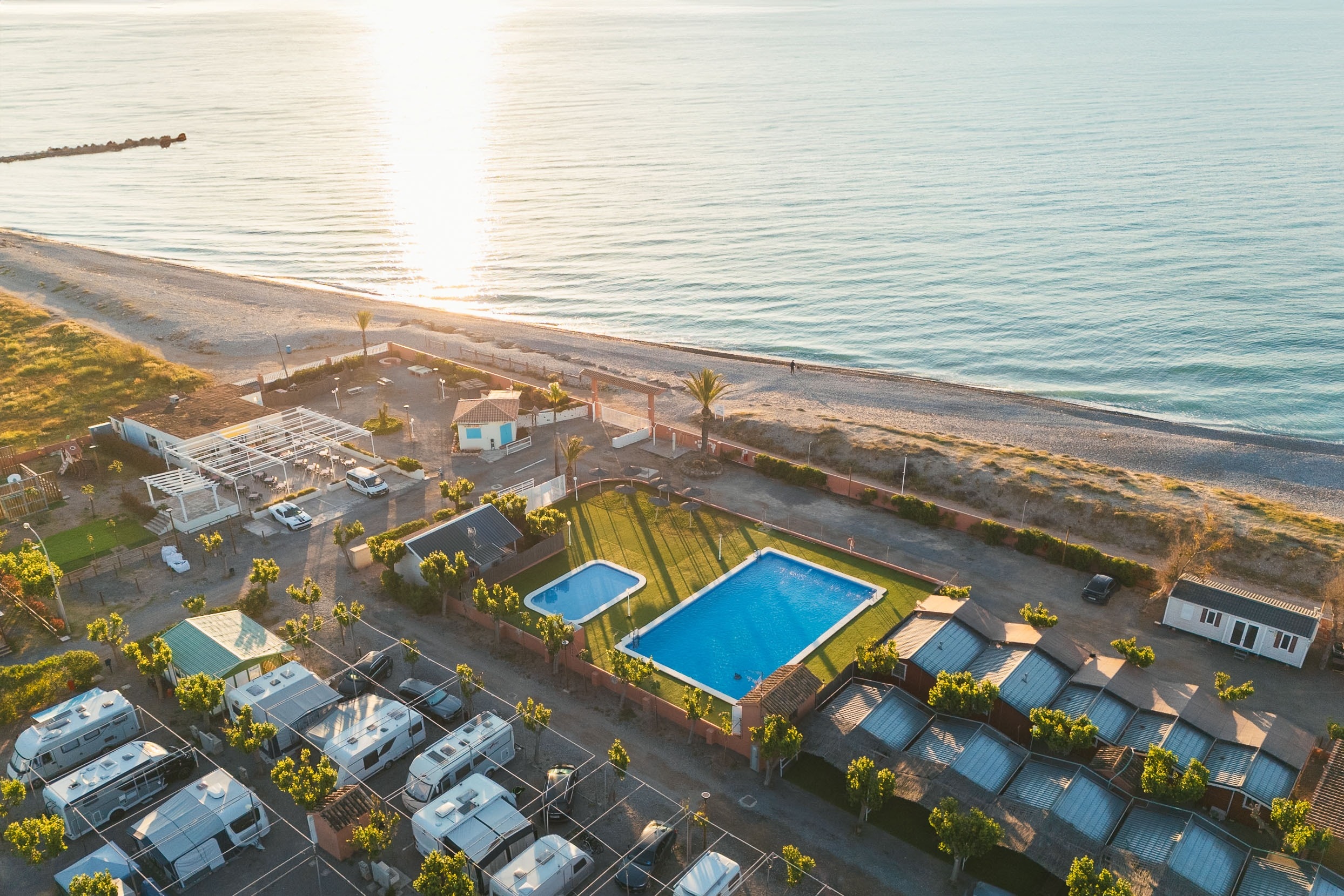 Spaanse camping vlak aan de zee met zandstrand, prima zwembad, bar en restaurant dat volledig gerenoveerd is (2023).